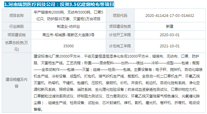 筆者從河南省企業(yè)項目備案系統(tǒng)了解到,自4月初至今,不到一個月的時間內,河南省這個區(qū)域內,有至少20家企業(yè)計劃建設熔噴布、口罩等項目,投資額從幾百萬元到幾千萬元不等。